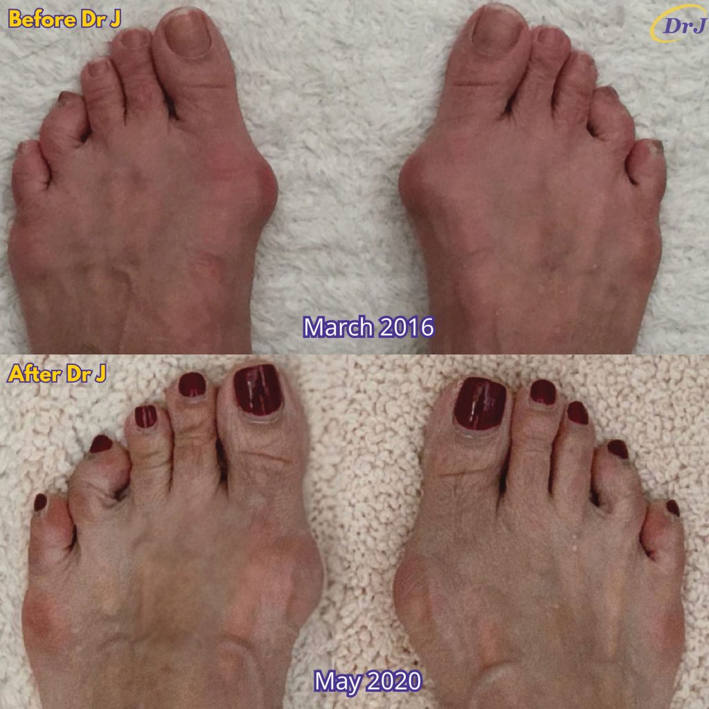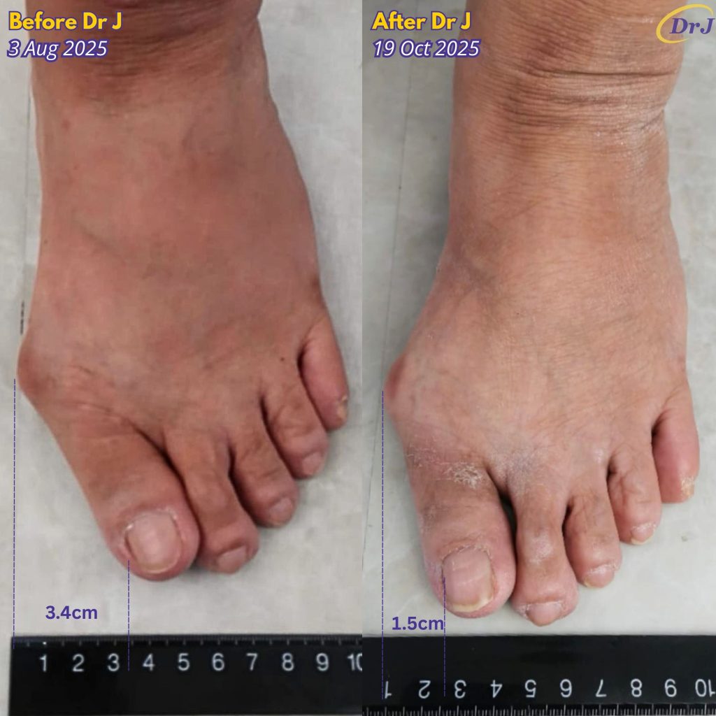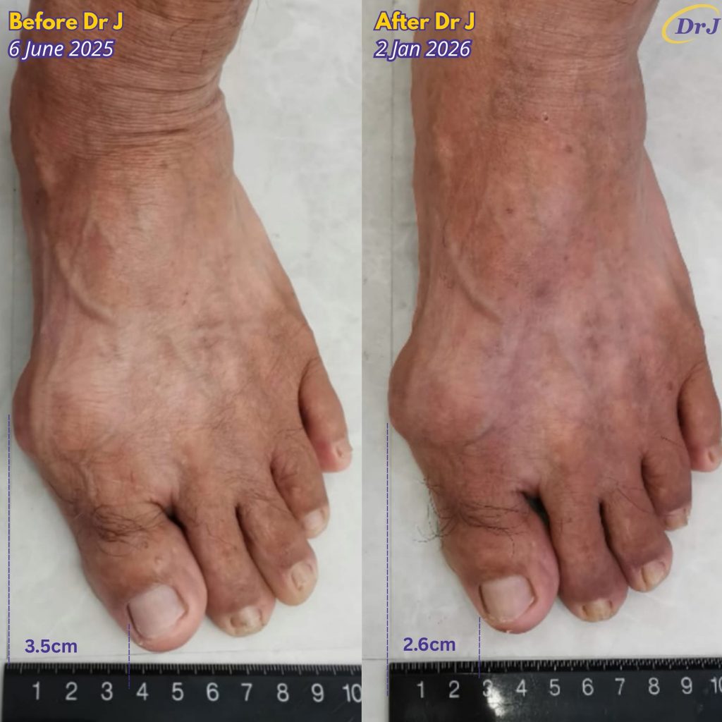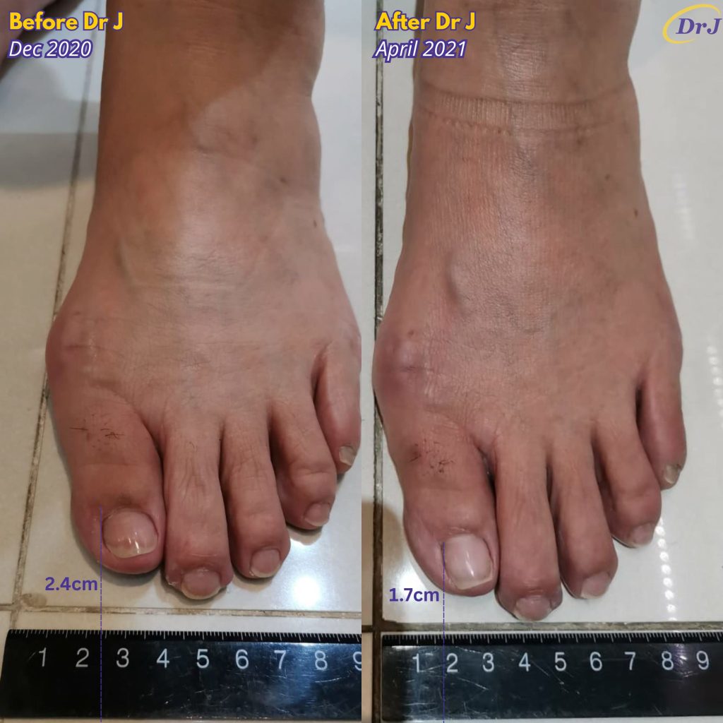 After wearing Dr J Arch and shoes for 6 months, both my bunions reduced by 1cm! My knee and spine also feels straighter. I am using Dr J Arch level 1 to 4. – Ai Liang, 74